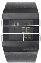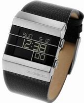 A flick of the wrist reveals a new time. This contemporary watch features a stainless steel case with black IP finish. Stainless steel crystal guard pushers and digital display. Black leather strap. Two-year limited warranty.